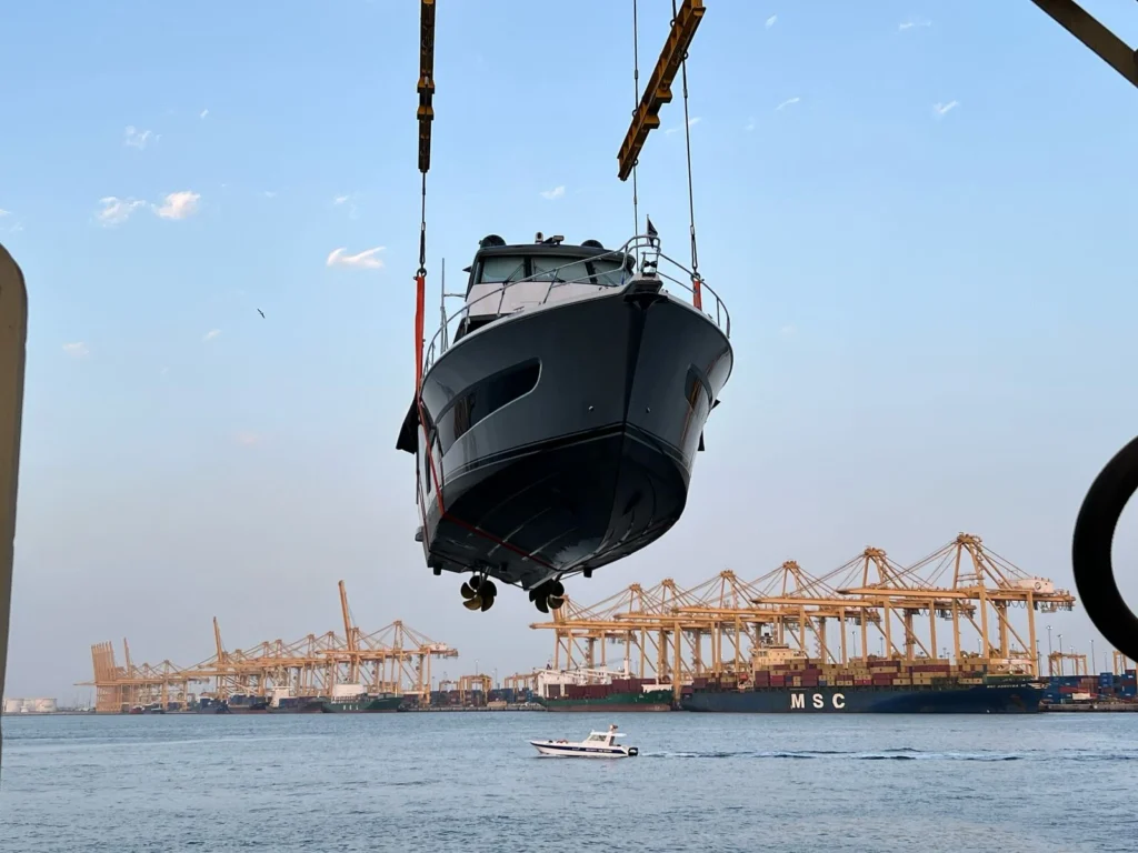 A Rivera 72 Sport MY yacht, measuring 24 meters in length, 6 meters in width, 9.5 meters in height, and weighing 80 tons, was successfully transported from Jebel Ali Port. The operation was a water-to-water transfer, meaning the yacht was afloat before loading and after discharge.